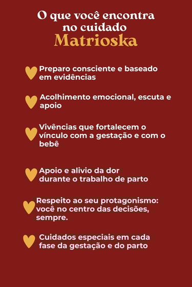 Aqui, no Matrioska, caminhamos com você por todo esse processo, oferecendo orientação, preparo e apoio, com informação de qualidade, carinho, escuta atenta, presença e afeto — da gestação ao pós-parto.